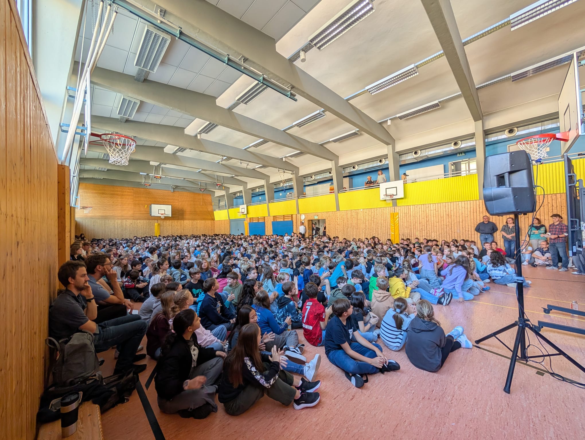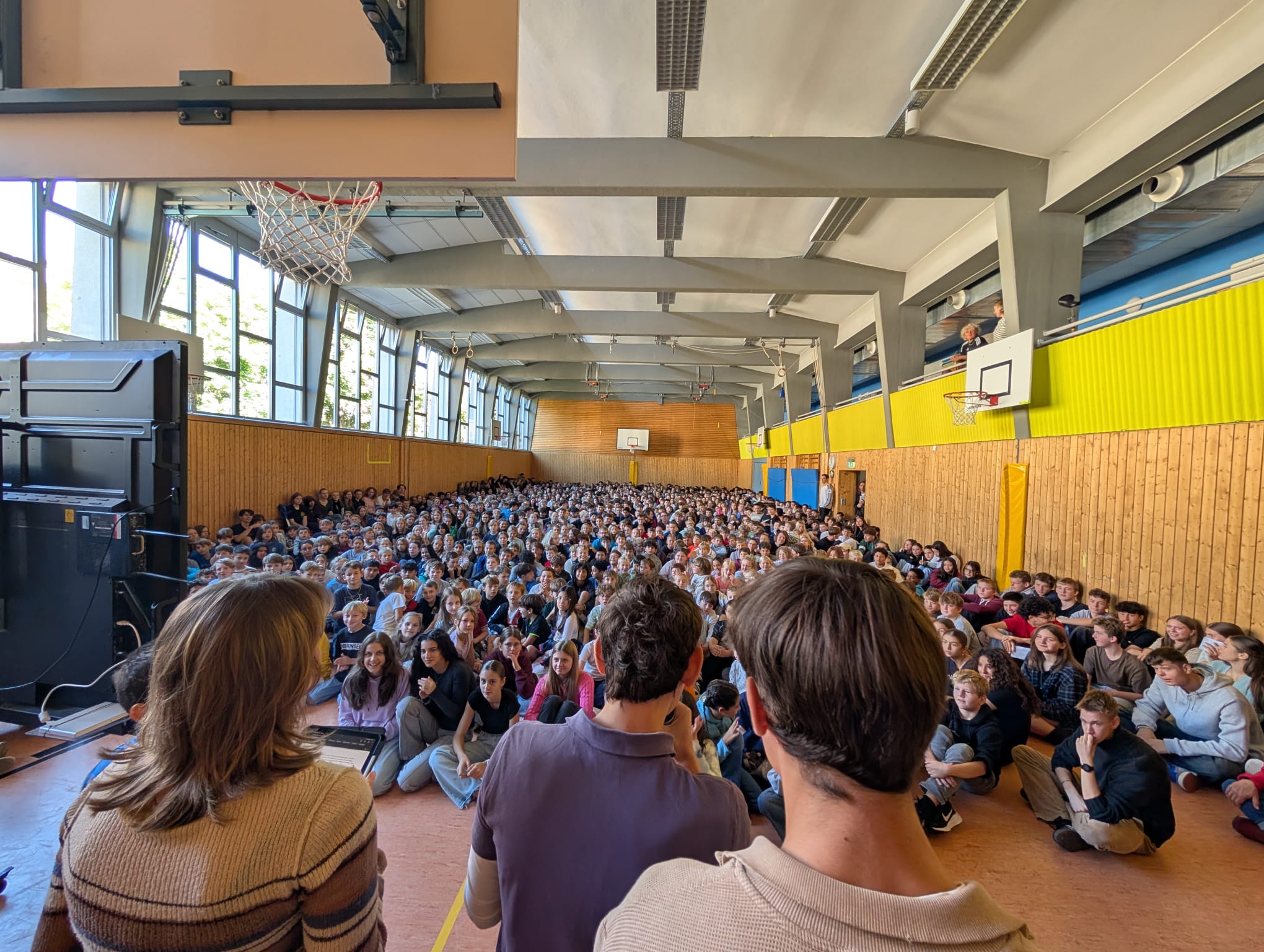 Am Donnerstag, dem 18. September 2025, in der 3. Stunde versammelten sich alle Schüler*innen des Otto-Hahn-Gymnasiums in der Turnhalle. Die Schülervertretung hatte zur Vollversammlung der Schülerschaft eingeladen, um das neue Schutzkonzept gegen (sexualisierte) Gewalt vorzustellen. Ziel des Schutzkonzepts ist es, dass sich am OHG alle sicher und geborgen fühlen können und jede/r weiß, wo er/sie sich Hilfe und Unterstützung in schwierigen Situationen holen kann. Außerdem soll es Handlungssicherheit schaffen für alle, die unsicher sind, wie sie in bestimmten Situationen am besten reagieren und handeln sollten. Das Schutzkonzept gegen (sexualisierte) Gewalt findet ihr hier.