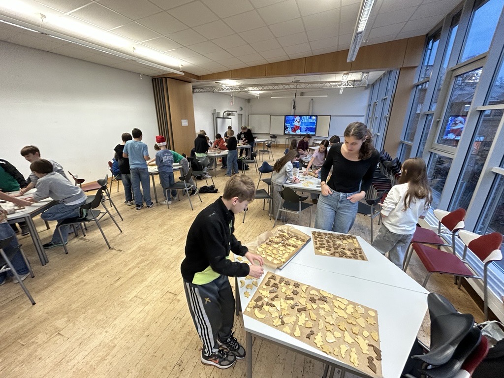 Am vergangenen Mittwoch hat sich die GTS in eine Weihnachtsbäckerei verwandelt. Während im Hintergrund Weihnachtslieder ertönten, waren die Schülerinnen und Schüler der 5b gemeinsam mit Frau Hackbarth, Herr Gerriets und Frau Burckgard tatkräftig am Ausstechen, Backen und Verzieren von Plätzchen. Natürlich musste das Werk auch probeweise verköstigt werden.