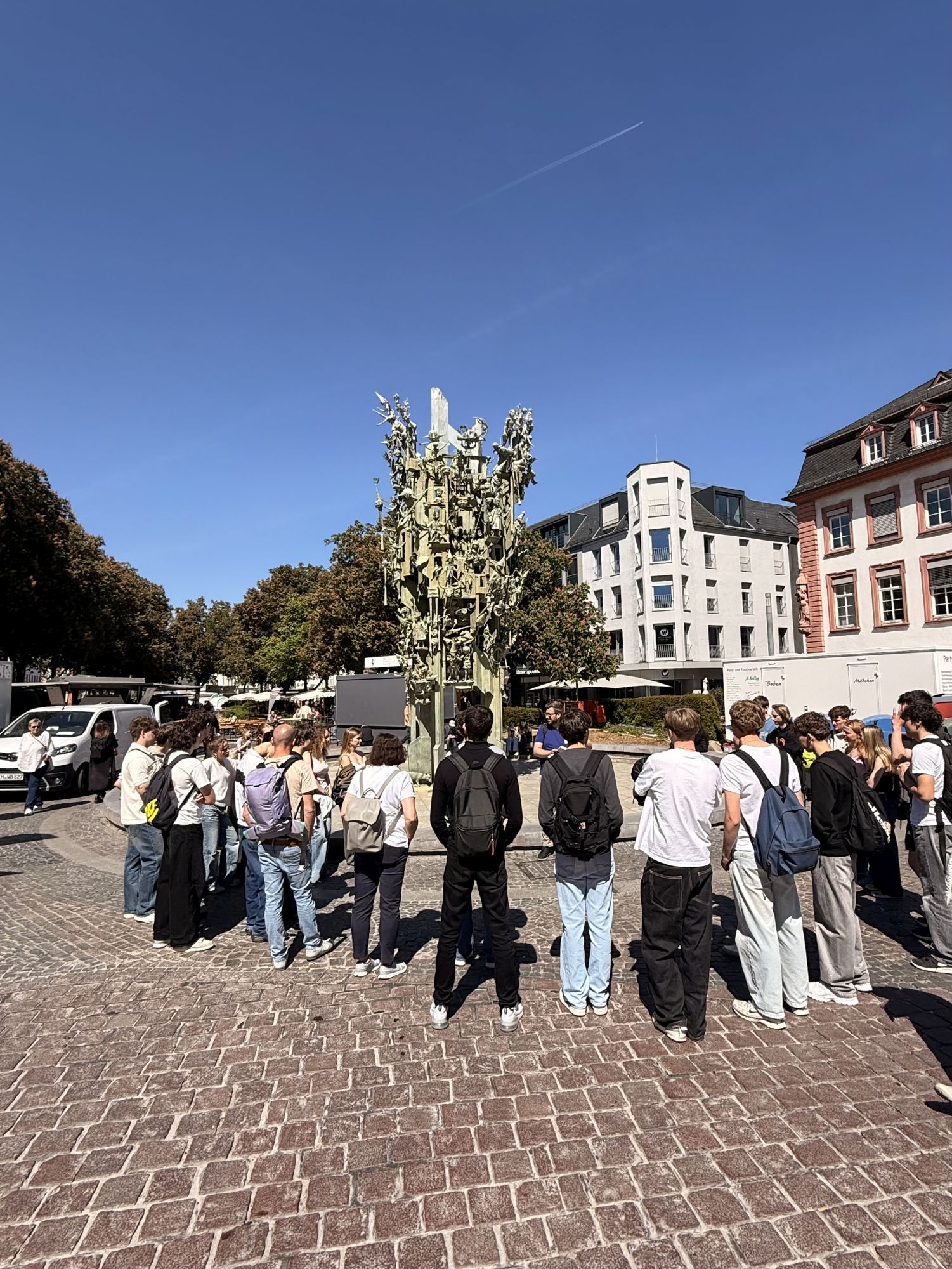 Dank der großzügigen Unterstützung des Kreises der Freunde unserer Schule konnten wir morgens mit dem Bus nach Mainz zum Gartenfeldplatz fahren, der den Beginn des Rundgangs markierte und bereits grundlegende Veränderungen in Hinblick auf die Gentrifizierung durchlebt hat. Der Rundgang beinhaltete einen umfassenden Spaziergang durch die Stadt sowie Vorträge über markante Standorte und deren historische Vergangenheit wie z. B. die Verteidigungsringe des mittelalterlichen Mainz und deren unterirdischen Verbindungstunnel.